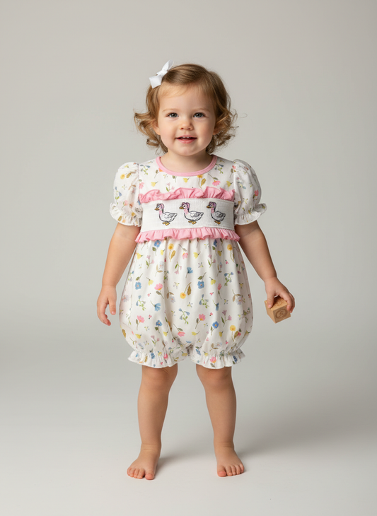 Smocked and embroidered Geese bubble romper