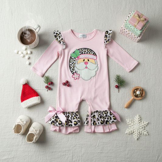 Pink santa leopard ruffled romper