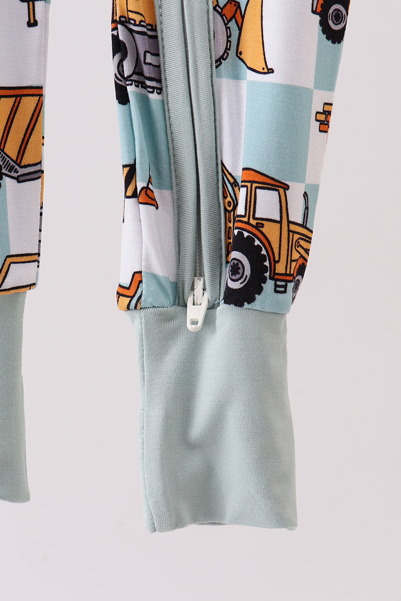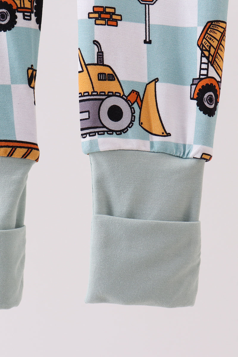 Get your little builder ready for adventure in this playful green excavator checkered romper! Made from soft, breathable bamboo fabric, it keeps your child comfy while they explore and play. The fun checkered pattern with bright excavator prints adds a splash of imagination to everyday wear, making it perfect for active days and cozy naps alike. Easy to slip on and move around in, this romper combines style and comfort for your busy little one.