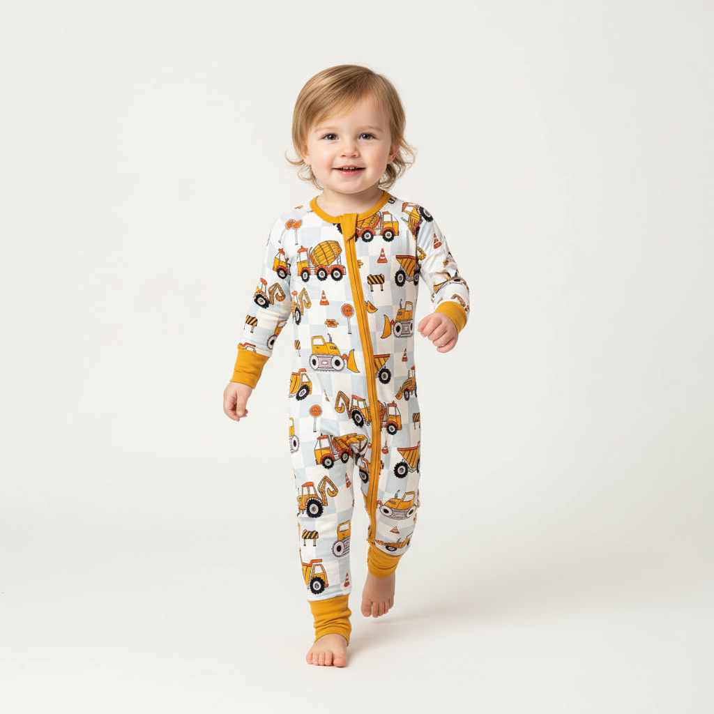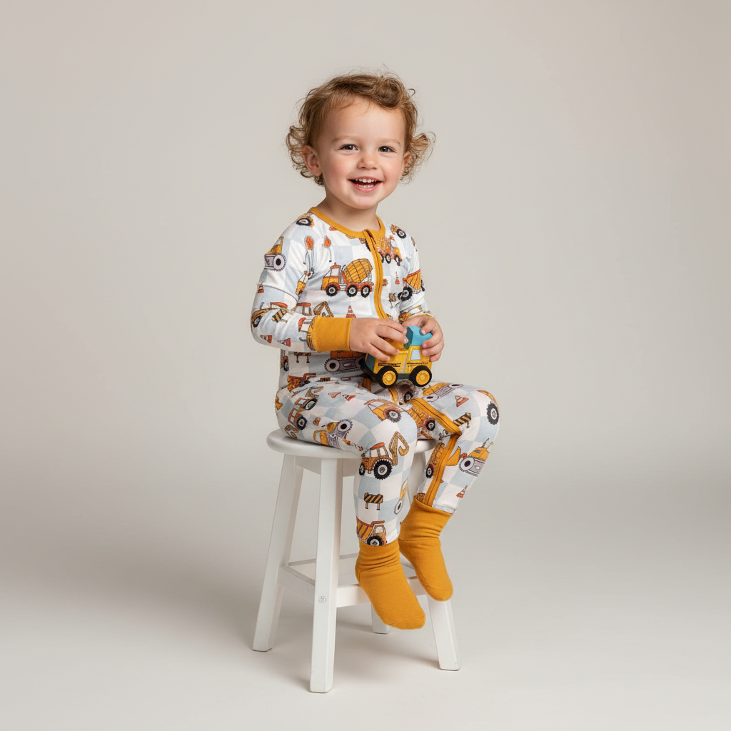 Get ready for sweet dreams and big adventures with this adorable Construction Zone Bamboo Zipper Pajama. Featuring a playful print of trucks, diggers, and construction cones, this cozy one-piece is perfect for little ones who love all things that go!