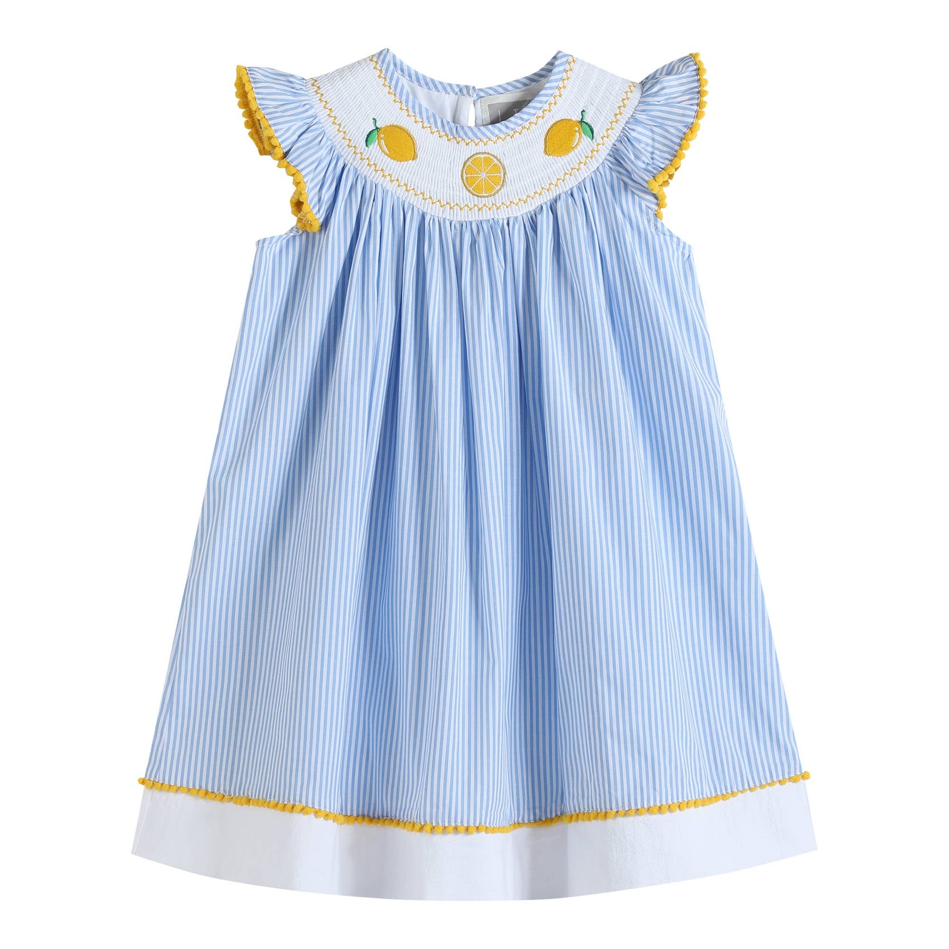 Adorable and sweet! This smocked dress is made in a pretty light blue stripe print featuring lemon embroidery, beautiful trim. Made in 100% soft cotton and features buttons for easy changing. The perfect choice for backyard BBQ's, days at the beach or a playdate. Either way it will become a go-to in any little girls closet.