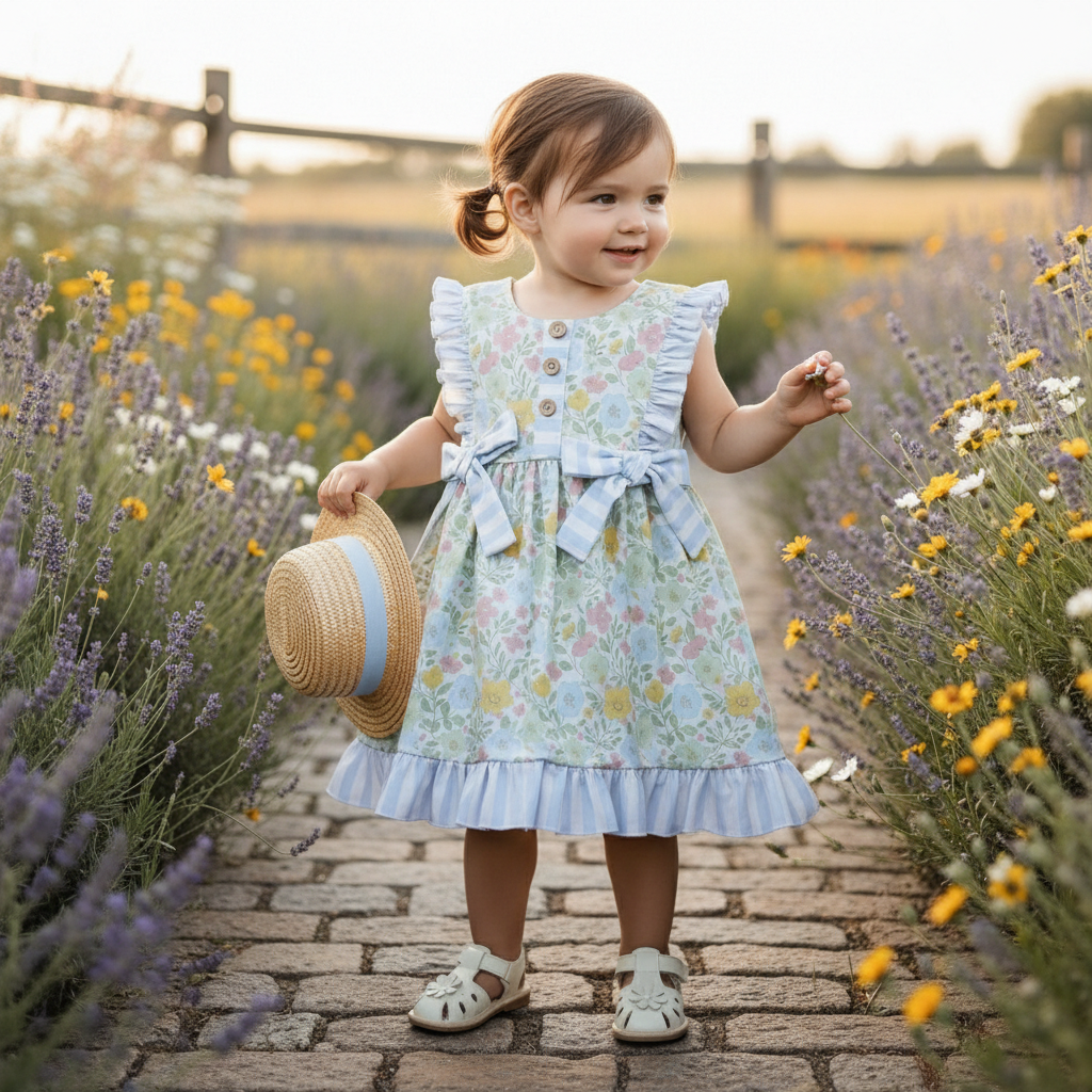 Crafted from lightweight, breathable fabric, it’s perfect for playdates, picnics, and picture-perfect outings. The back button closure makes dressing easy, while the full skirt adds a touch of twirl-worthy fun.