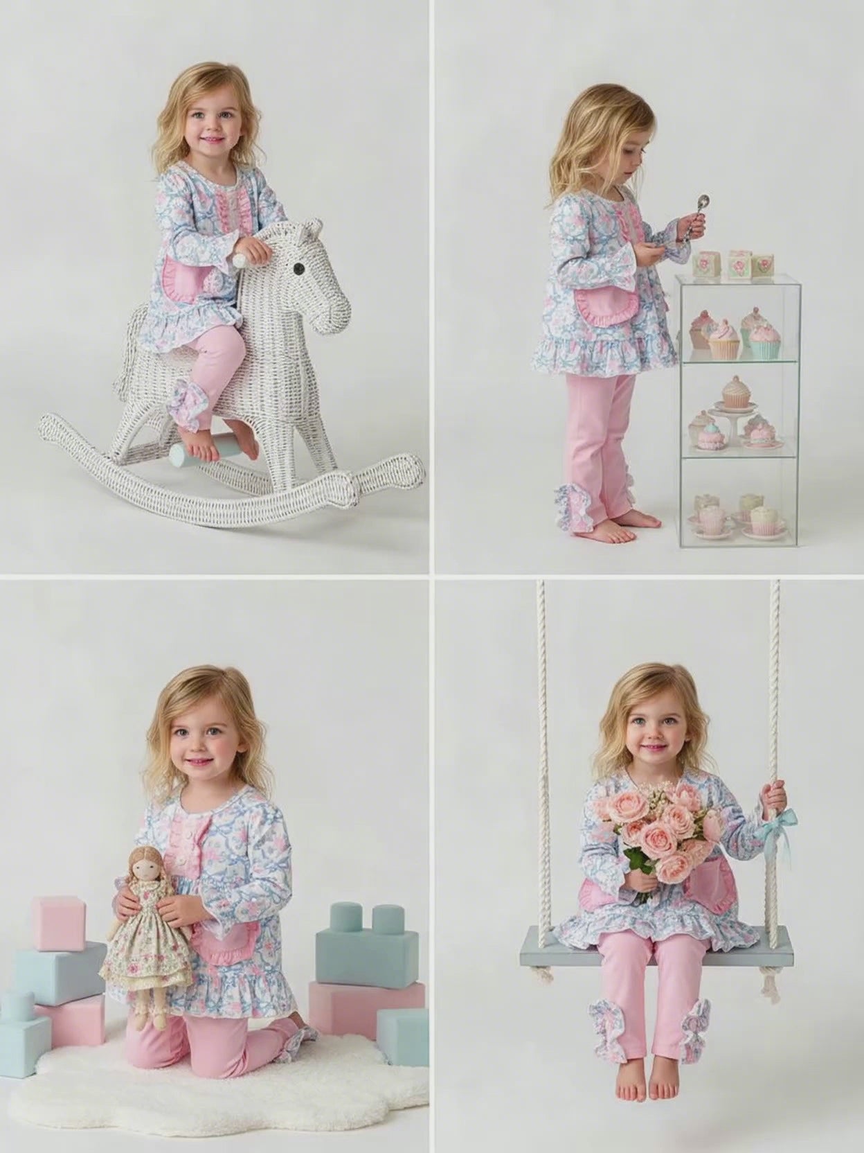 Featuring a soft floral top with delicate blue and pink hues, this outfit is perfect for everyday wear. The ruffled hem and pink pockets add a charming touch, while the matching pink leggings with floral ruffle cuffs complete the look with playful elegance.
