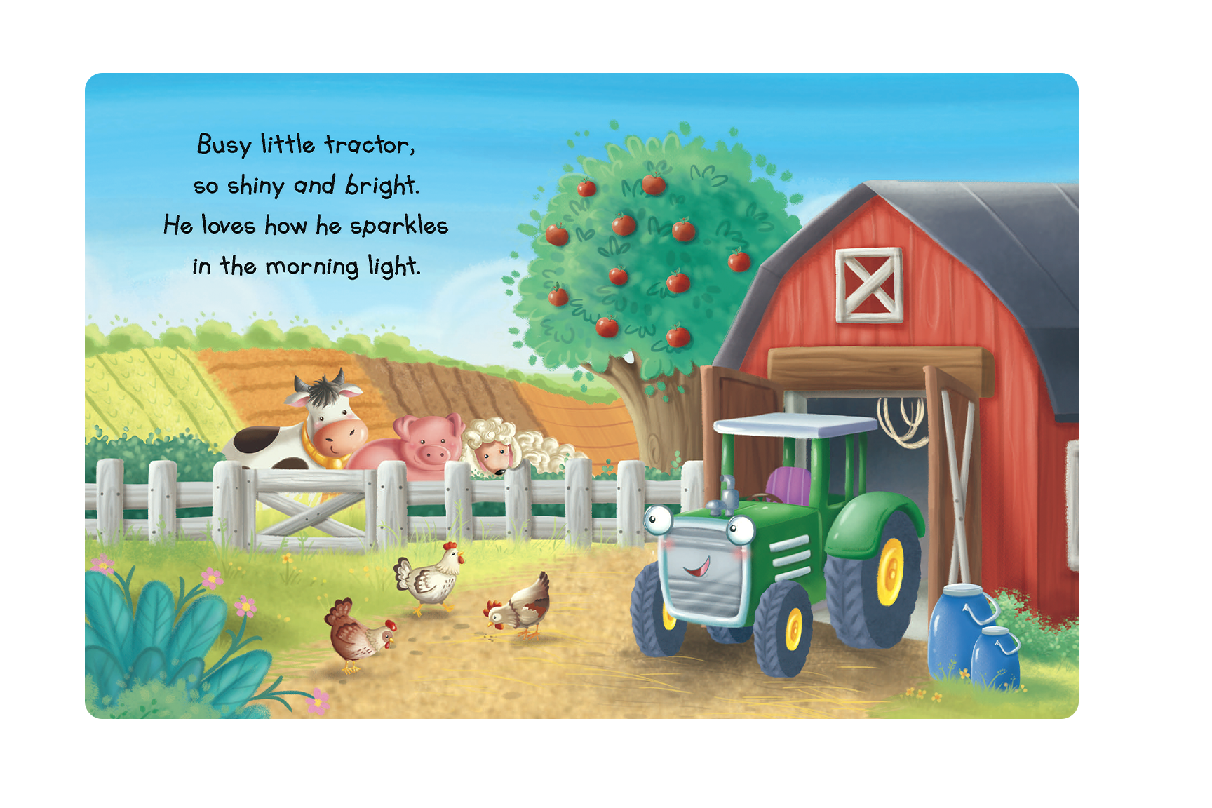* Charming and colorful illustrations of farm animals and a friendly tractor